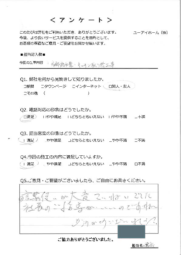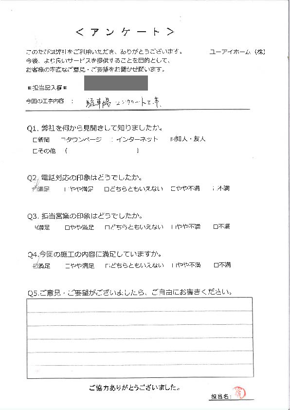 ユーアイホームでは、リフォーム完了後のお客様にアンケートをお願いしています。