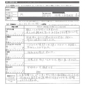 工程の進行に伴い、毎日のように責任者より工事内容の説明があり、かんじんなところは殆ど相談があり又直接職人からも相談がり、満足した。