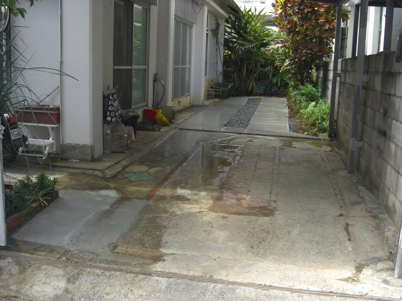 庭はコンクリートを打設し、中央部分に砂利を敷きました