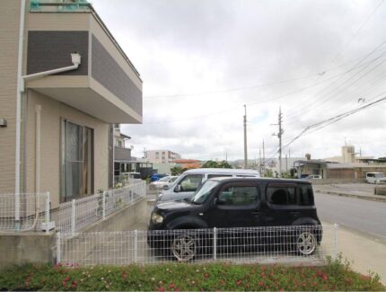 ななめ前方から。 カーポートの奥には、デッキへ上がる鉄骨階段があります