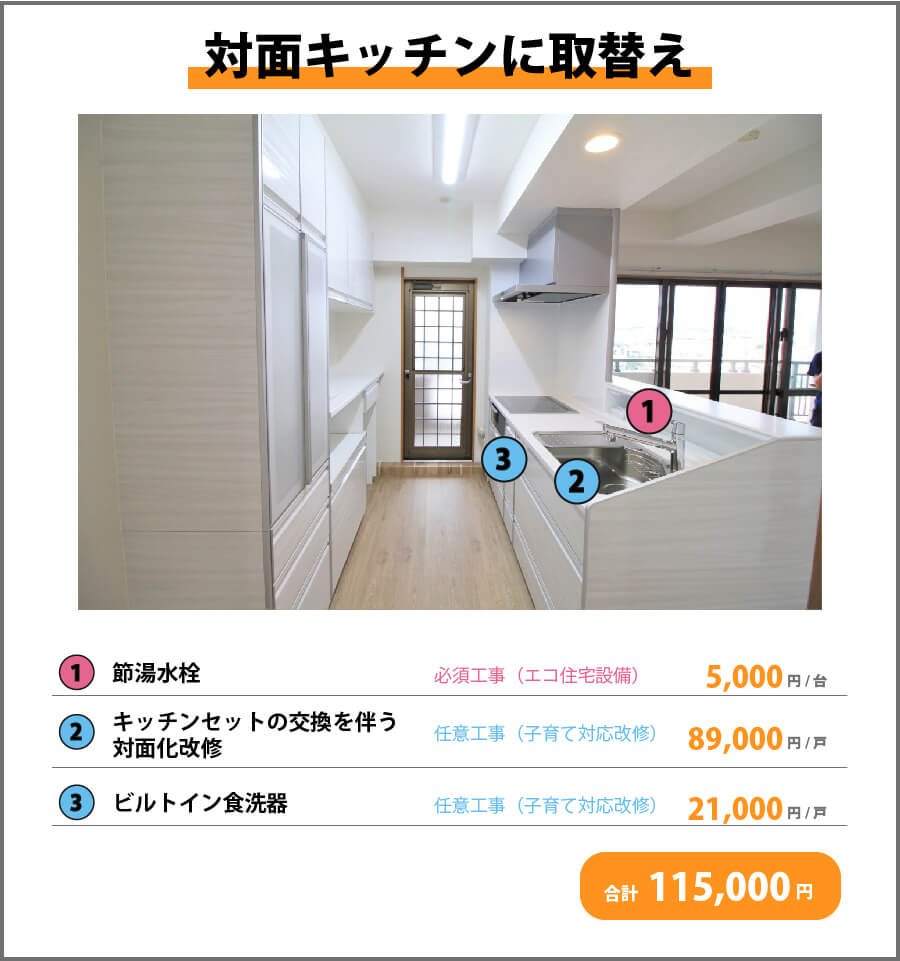 こちらも節湯水栓が必須工事となりますが、壁付けから対面キッチンにリフォームした場合は89000円が加算されます
