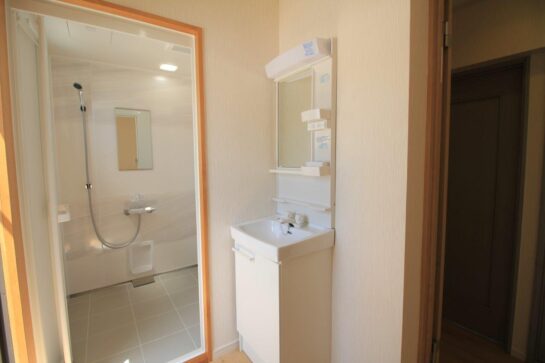 小さい方のベランダに、浴室(タカラスタンダード ぴったりサイズシャワーユニット)と脱衣所を増築しました(洗面化粧台:LIXIL オフト)