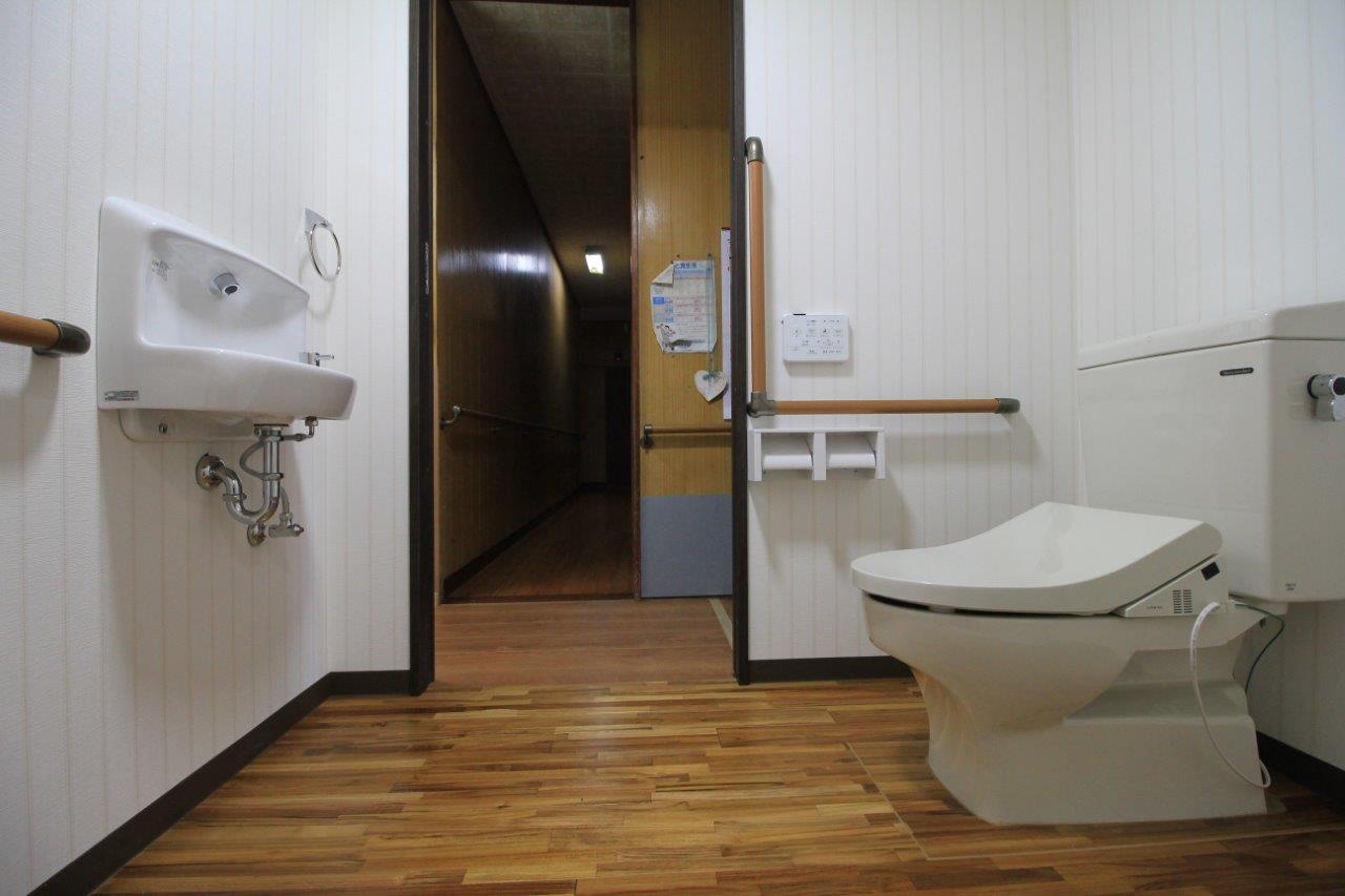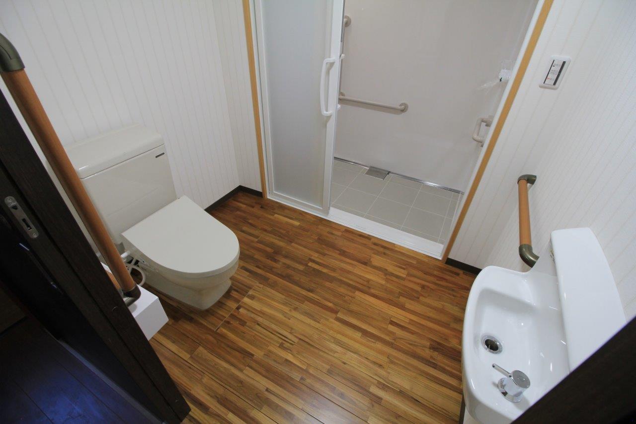 出入り口には、楽に開閉できる引き戸を設置し、手すりも取付けました。 手洗い器は車イスの妨げにならない様に薄いタイプを採用しました。