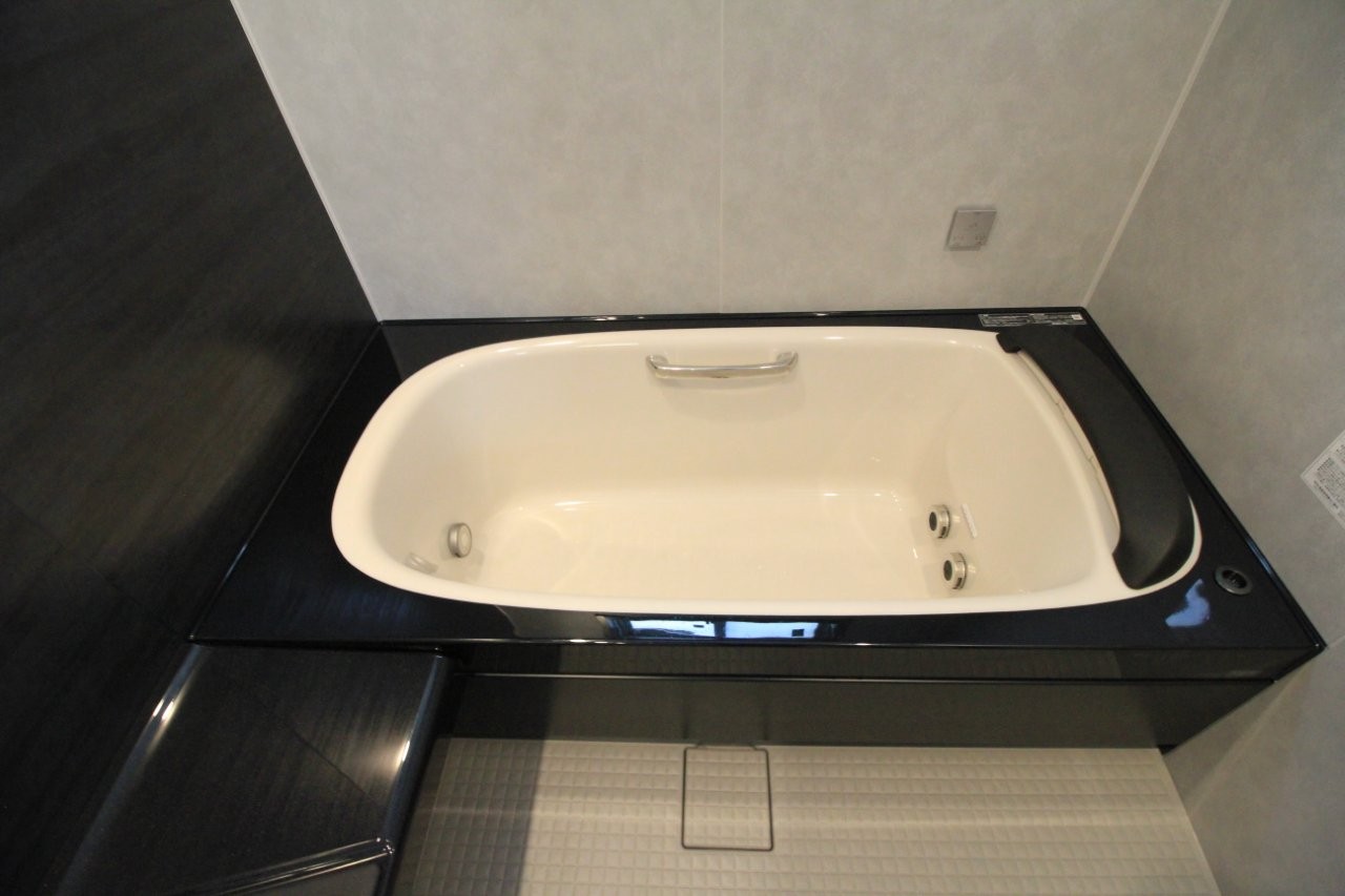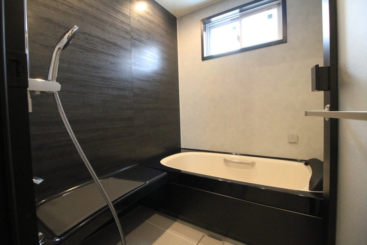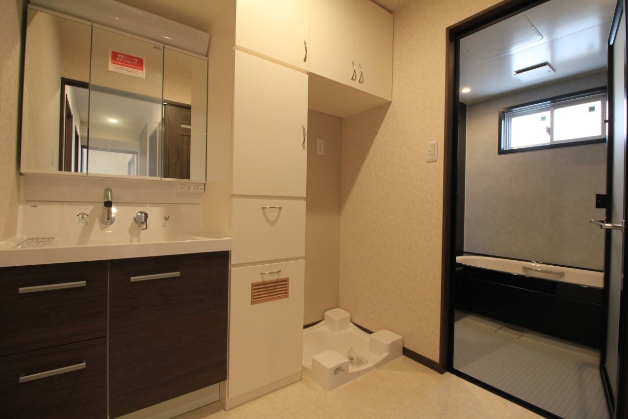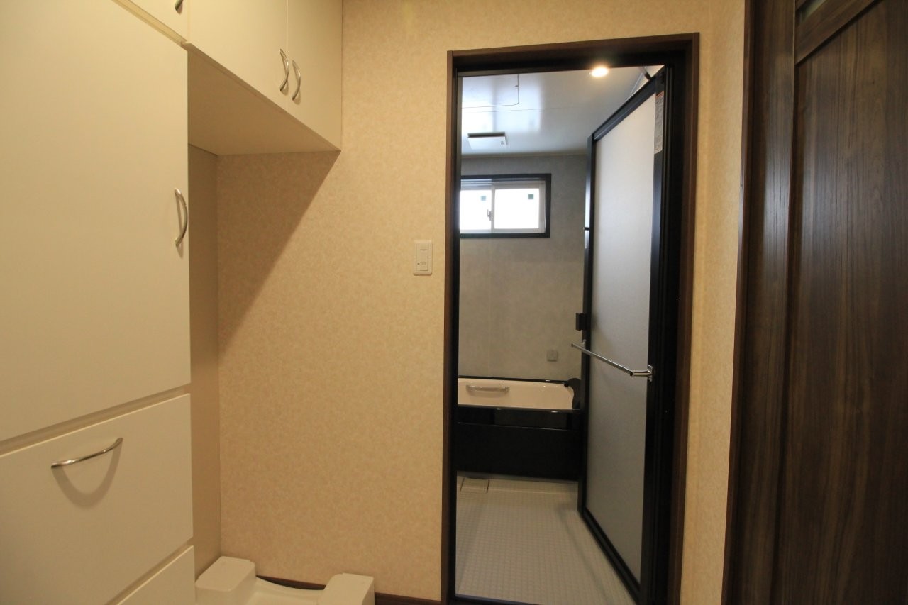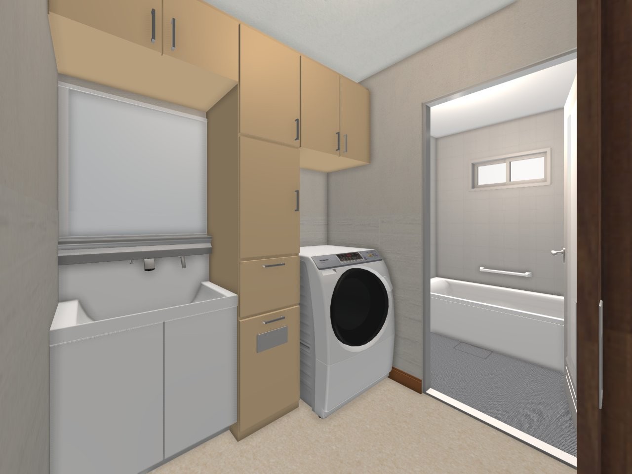 洗面室の奥にはシステムバスを配置しました。(LIXILのスパージュ)