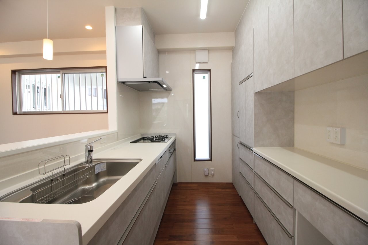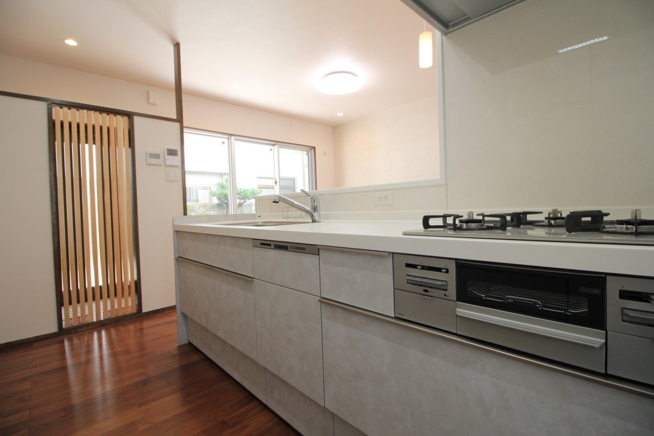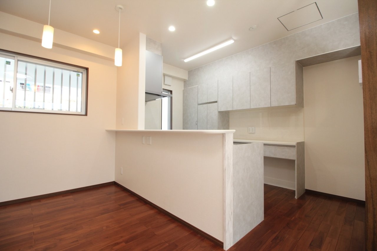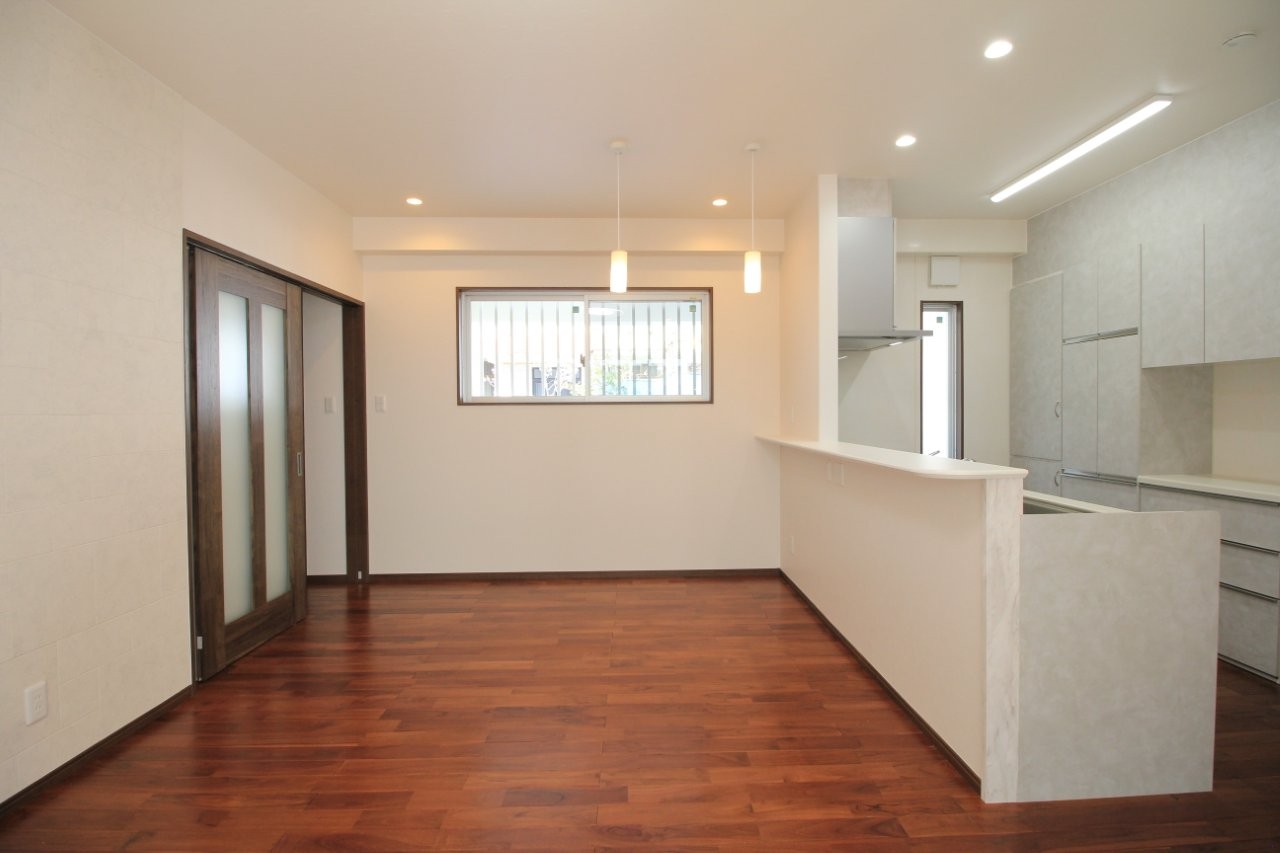貸店舗にしていた1階部分をスケルトンまで解体し、二世帯住宅にリノベーションしました。 駐車場の一部には、浴室やトイレ、洋室を増築しました。 水まわりの設備機器はLIXIL製品で統一し、キッチンや脱衣所の棚は造作しました。