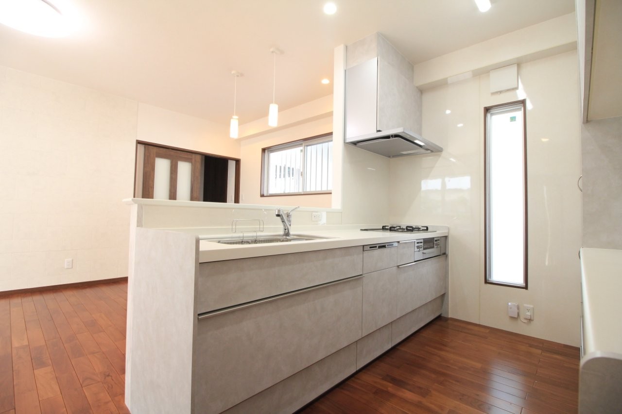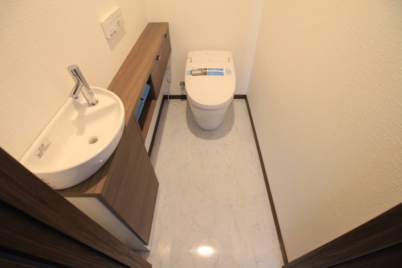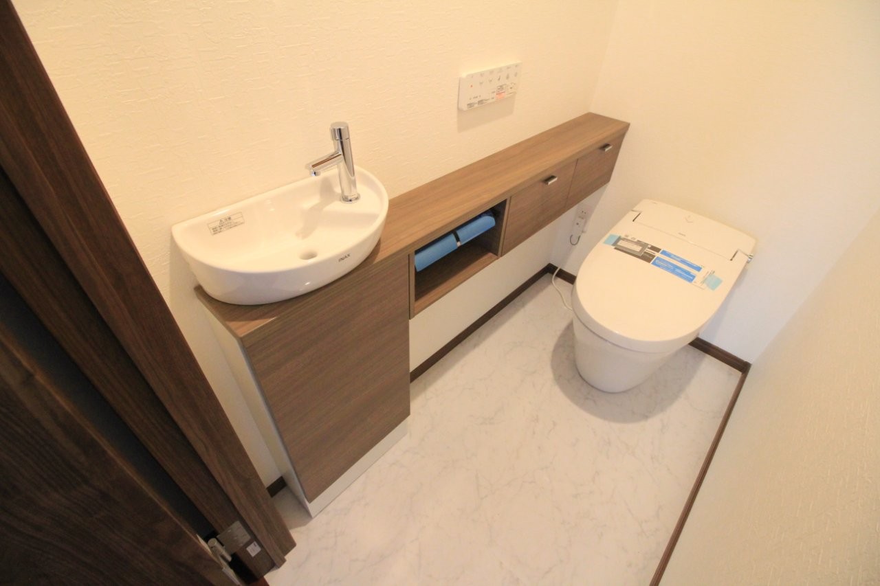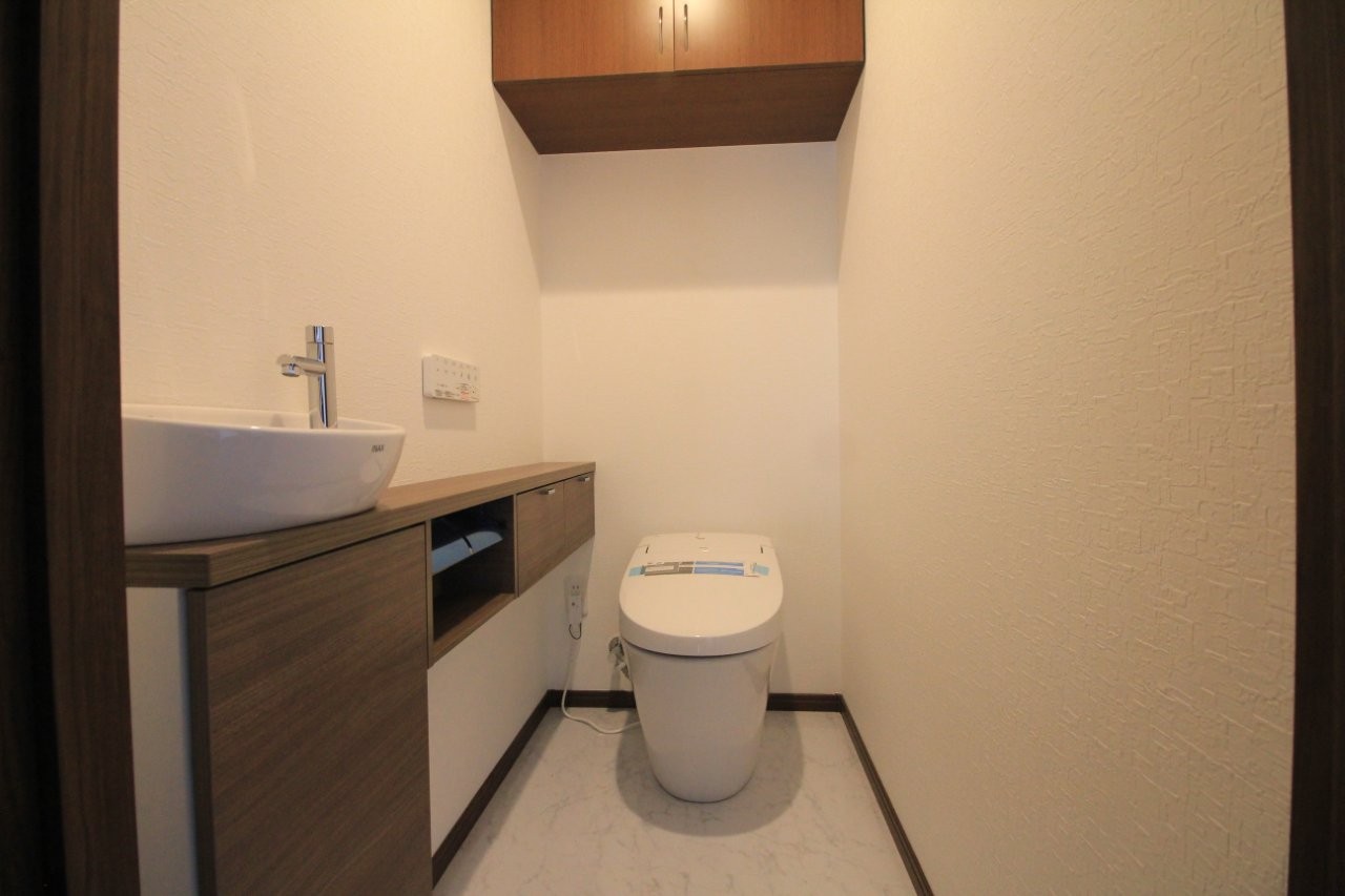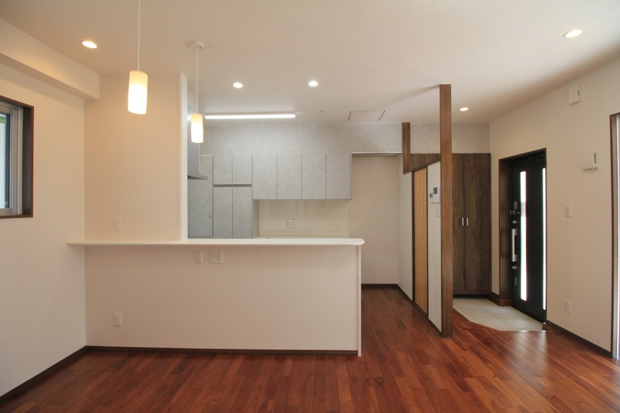 貸店舗にしていた1階部分をスケルトンまで解体し、二世帯住宅にリノベーションしました。 駐車場の一部には、浴室やトイレ、洋室を増築しました。 水まわりの設備機器はLIXIL製品で統一し、キッチンや脱衣所の棚は造作しました。