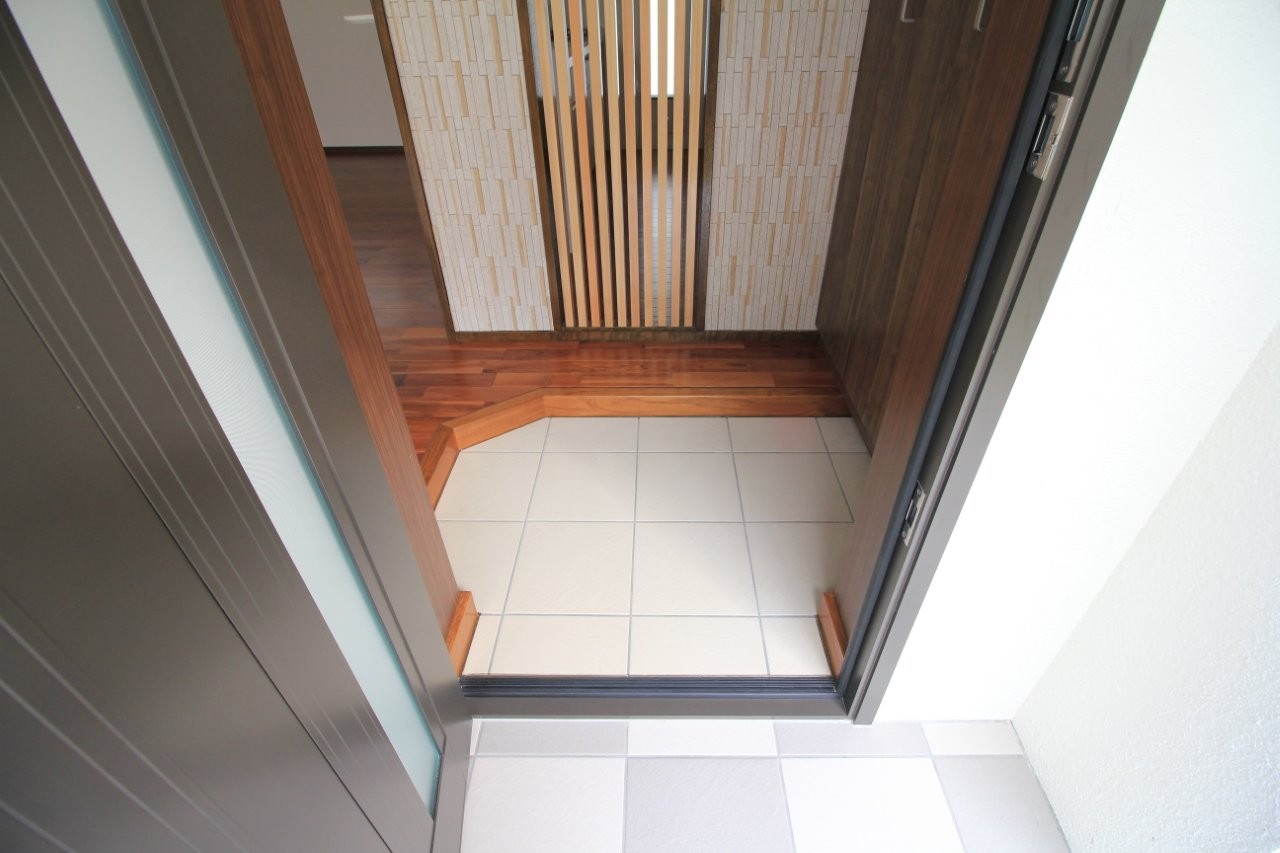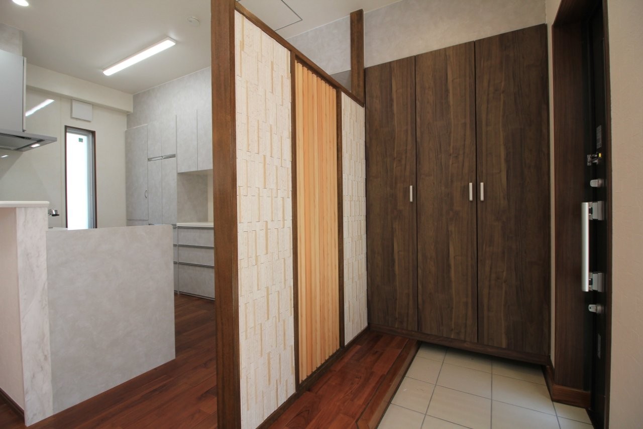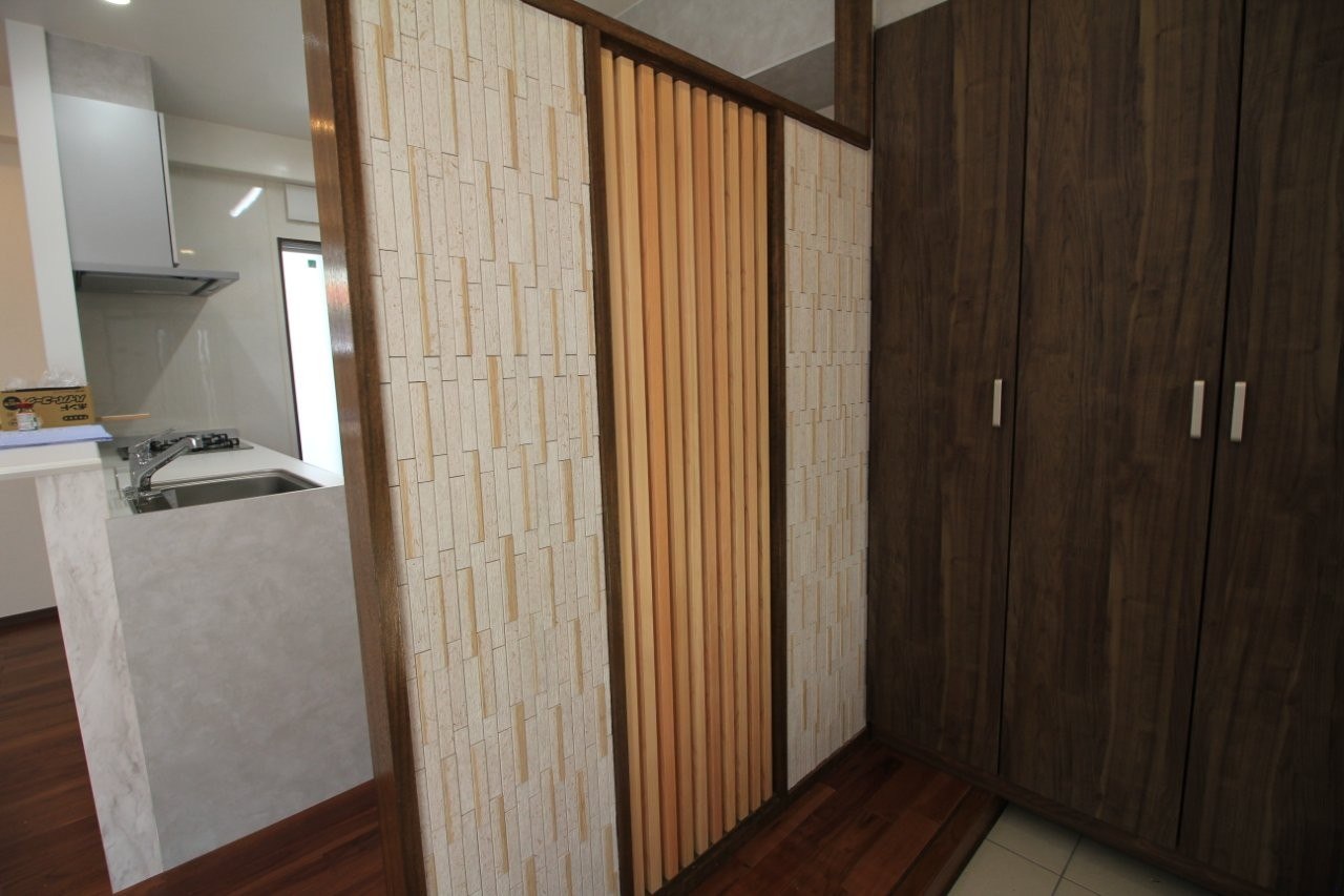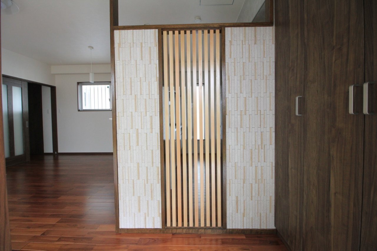 仕切り壁には(エコカラット)を貼り、中央部分は檜の格子を取り入れました。