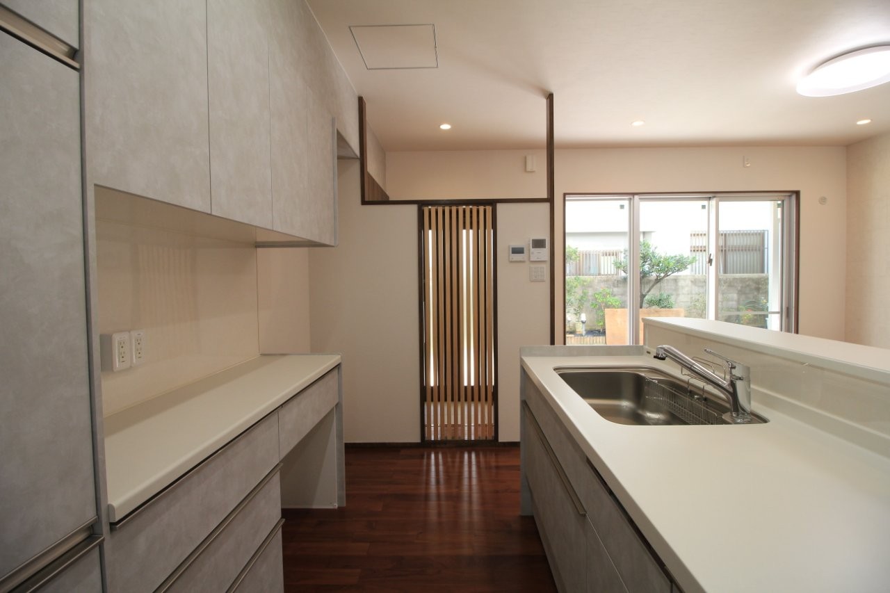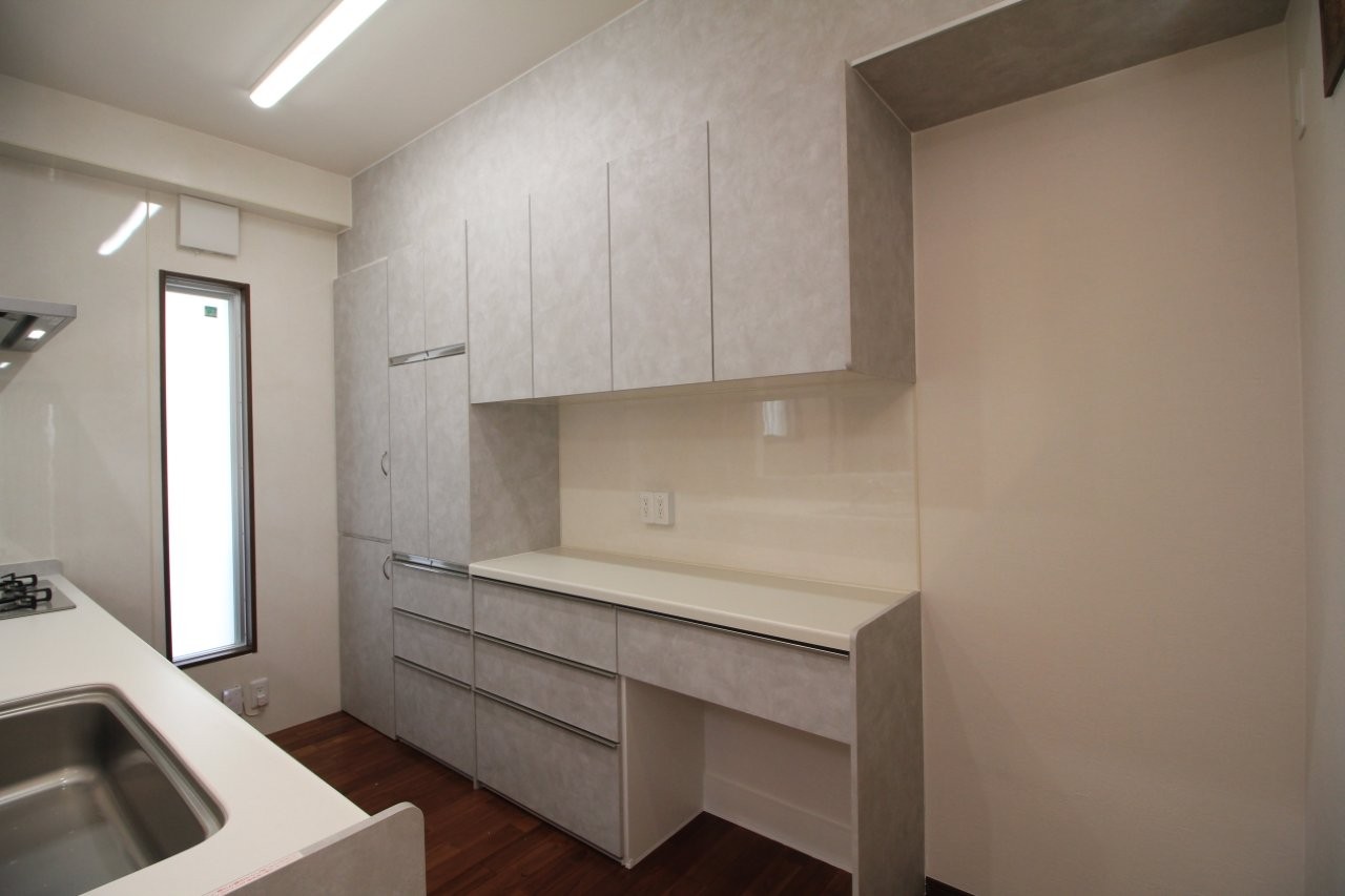 キッチン背面の収納は、奥さまの要望に合わせて造作しました。
