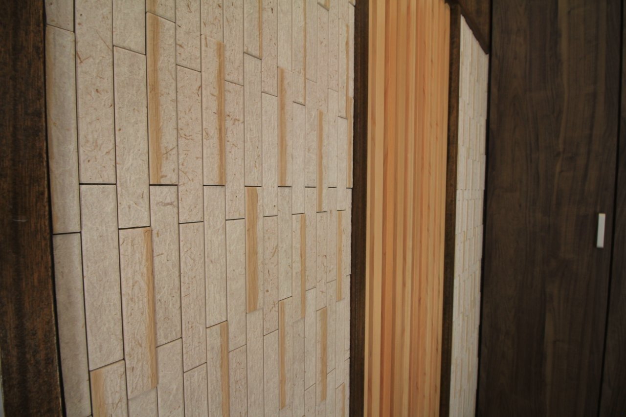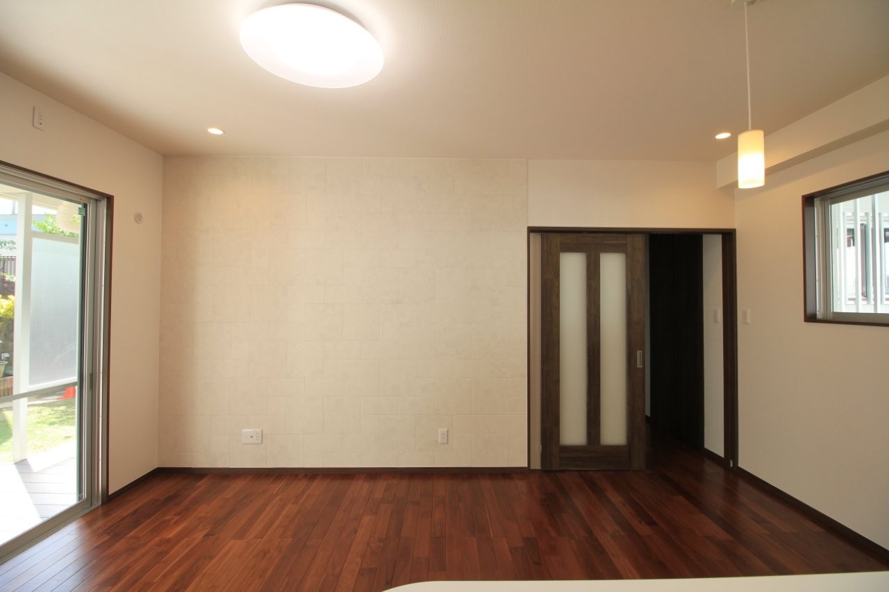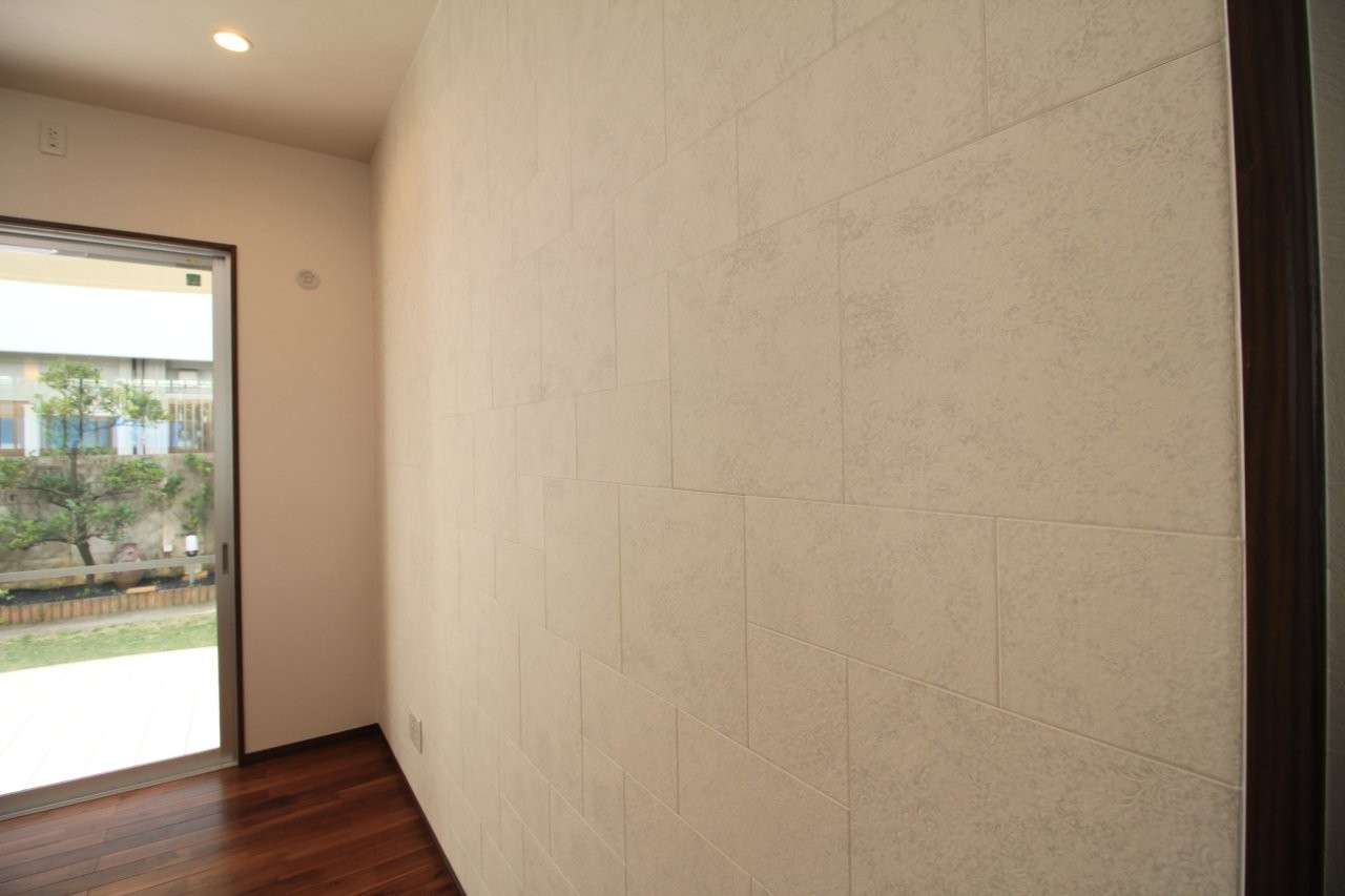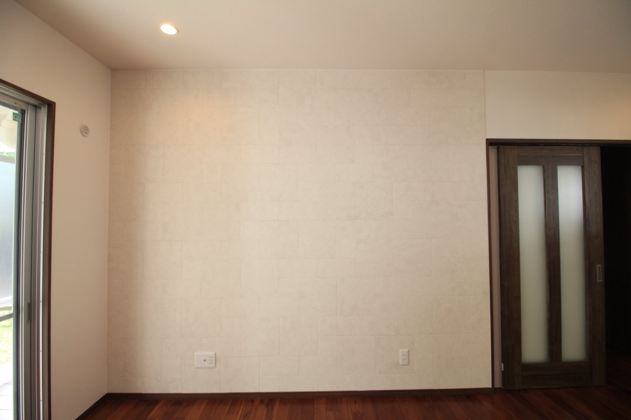 リビングの壁には、調湿・脱臭機能に優れた (エコカラット)を貼りました。
