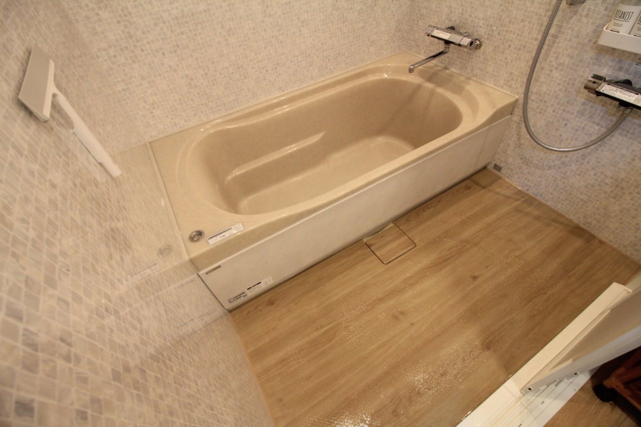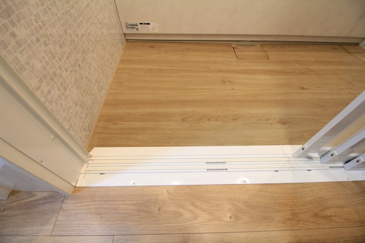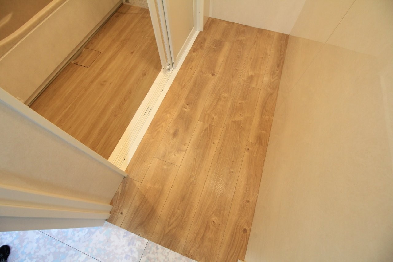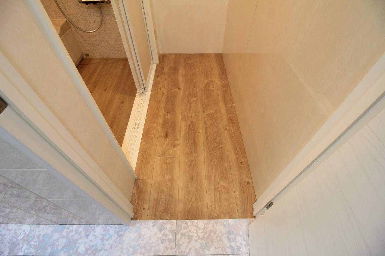 床は段差を解消し、浴室に合わせた木目調のフロアタイルで仕上げました。 ドアは引き戸から開き戸に取り替えました。