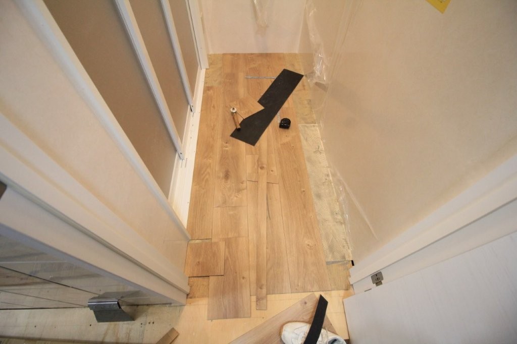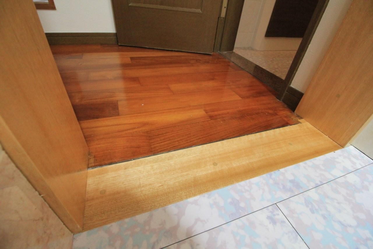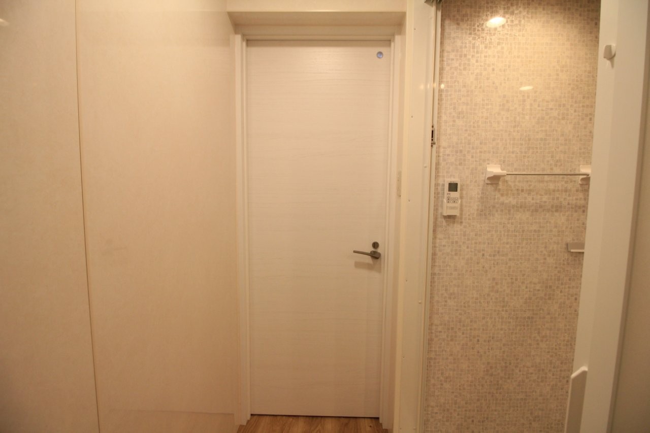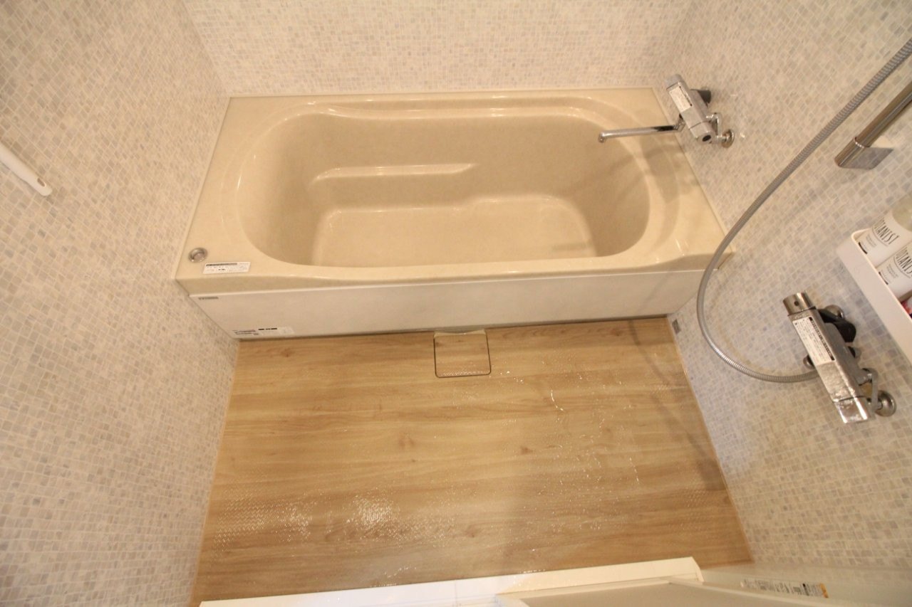 床は段差を解消し、浴室に合わせた木目調のフロアタイルで仕上げました。 ドアは引き戸から開き戸に取り替えました。