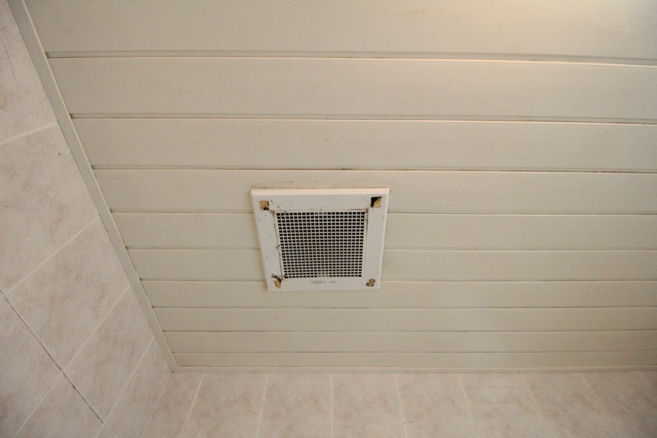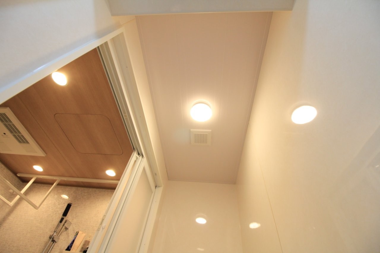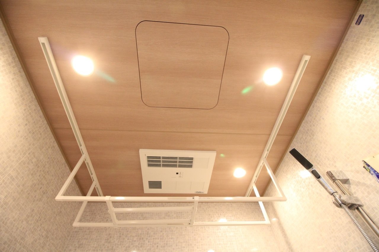 天井には、4つの機能(除湿する、冷やす、暖める、換気する)を備えた浴室用換気扇「乾爽!除湿ファン」と手前に動かせるハンガー「乾動!優レールハンガー」を設置しました。