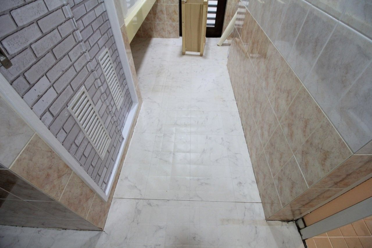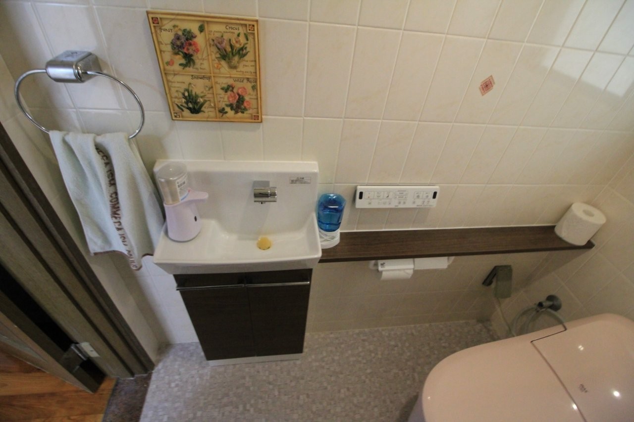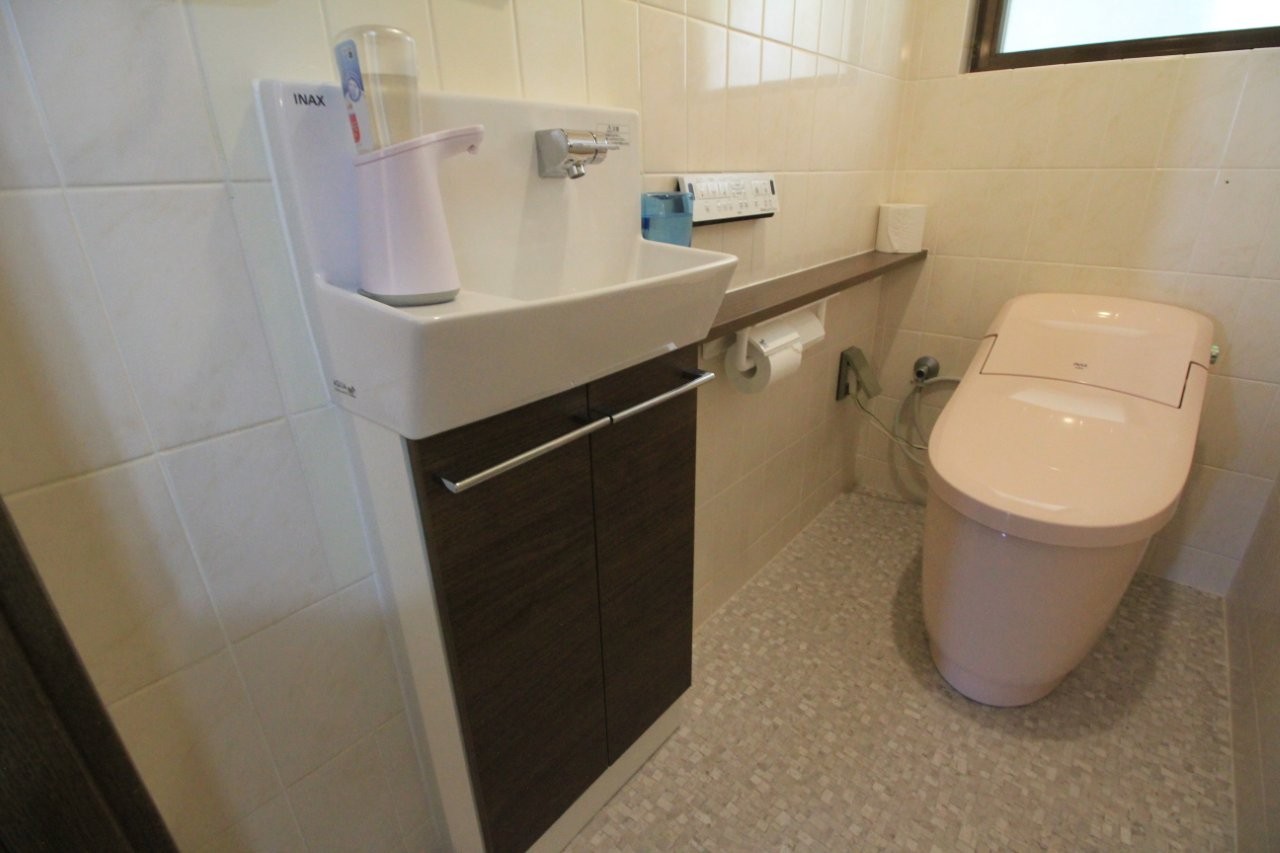 トイレは小便器と手洗い器を取替えて、床の段差を解消しました。 その他、クロスや玄関ポーチのタイルも貼り替えました。