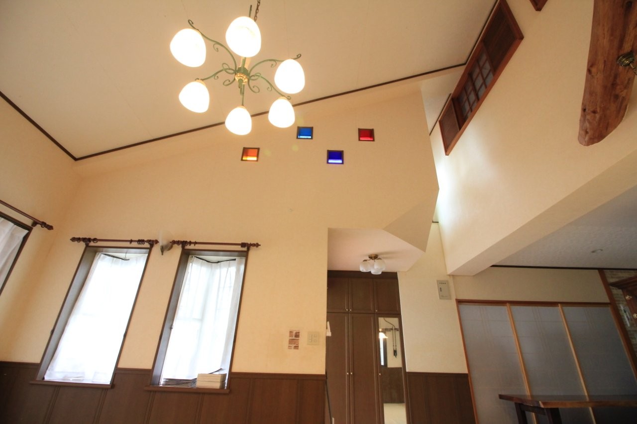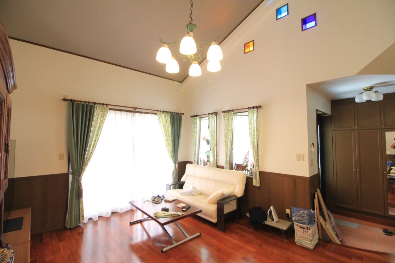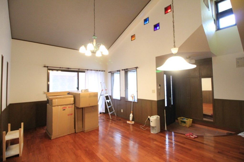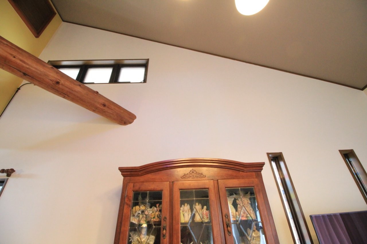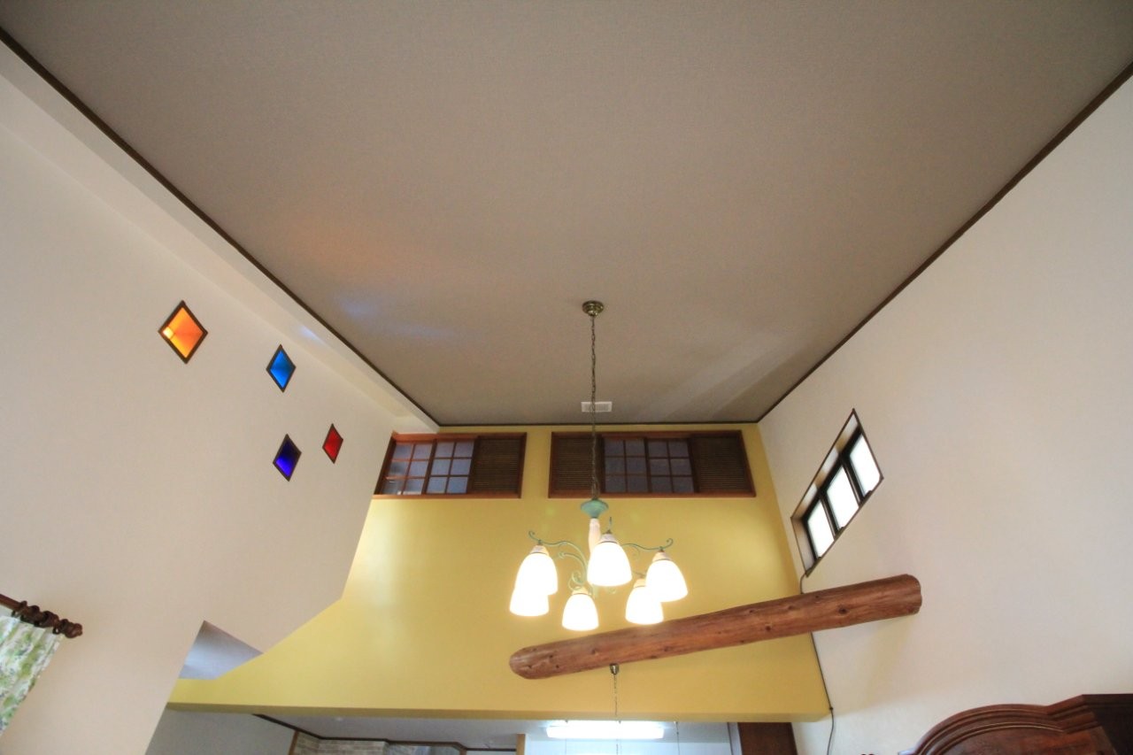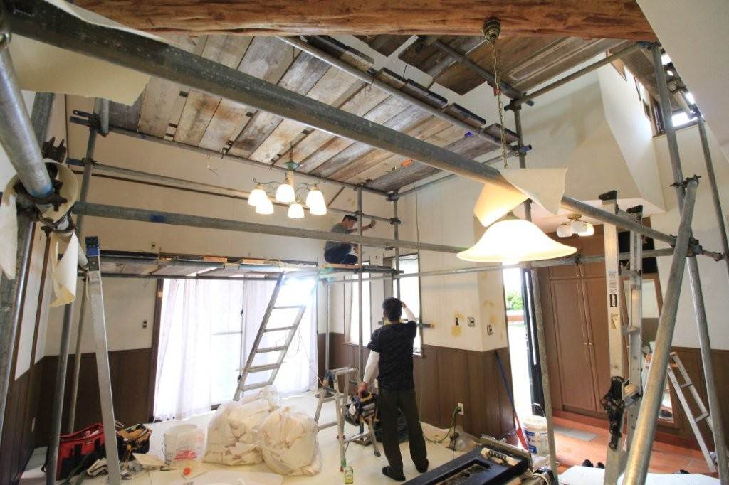 リビングの壁と天井のクロスを貼り替えました。 吹抜けの天井が高いため、足場を組んで作業を行いました。