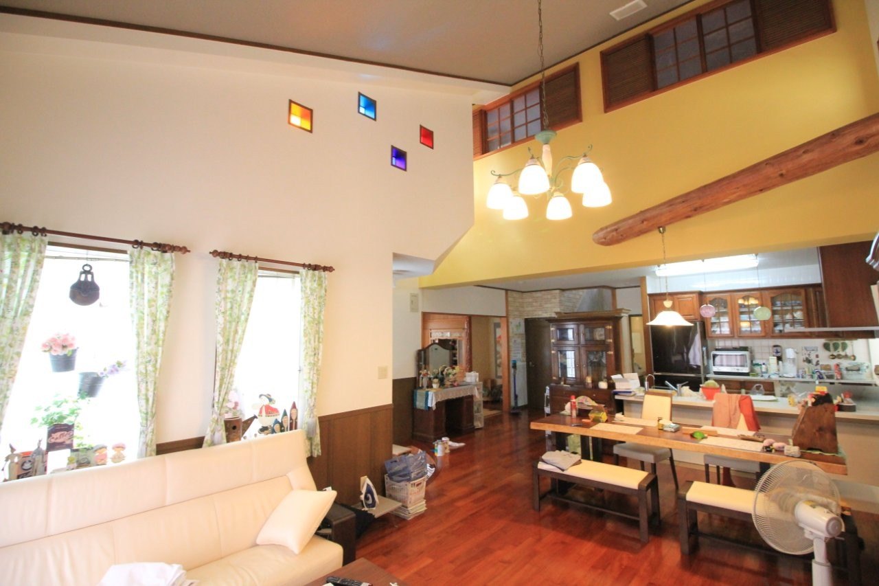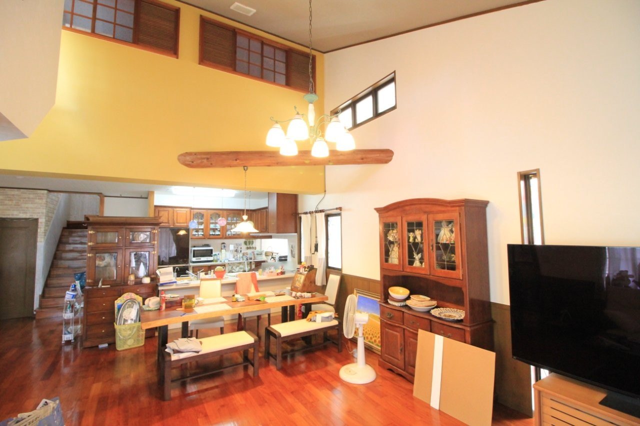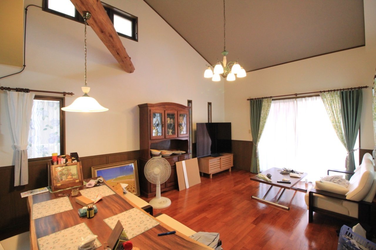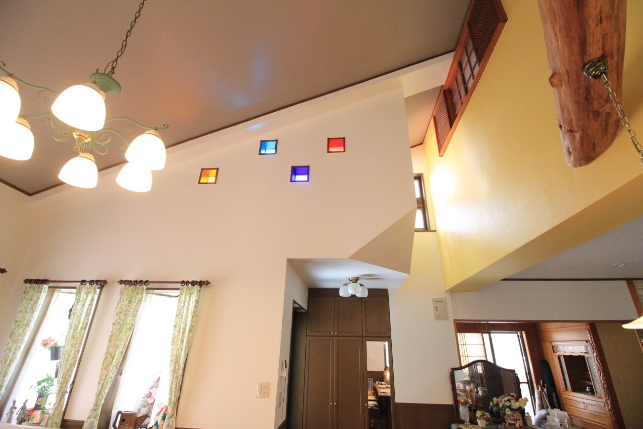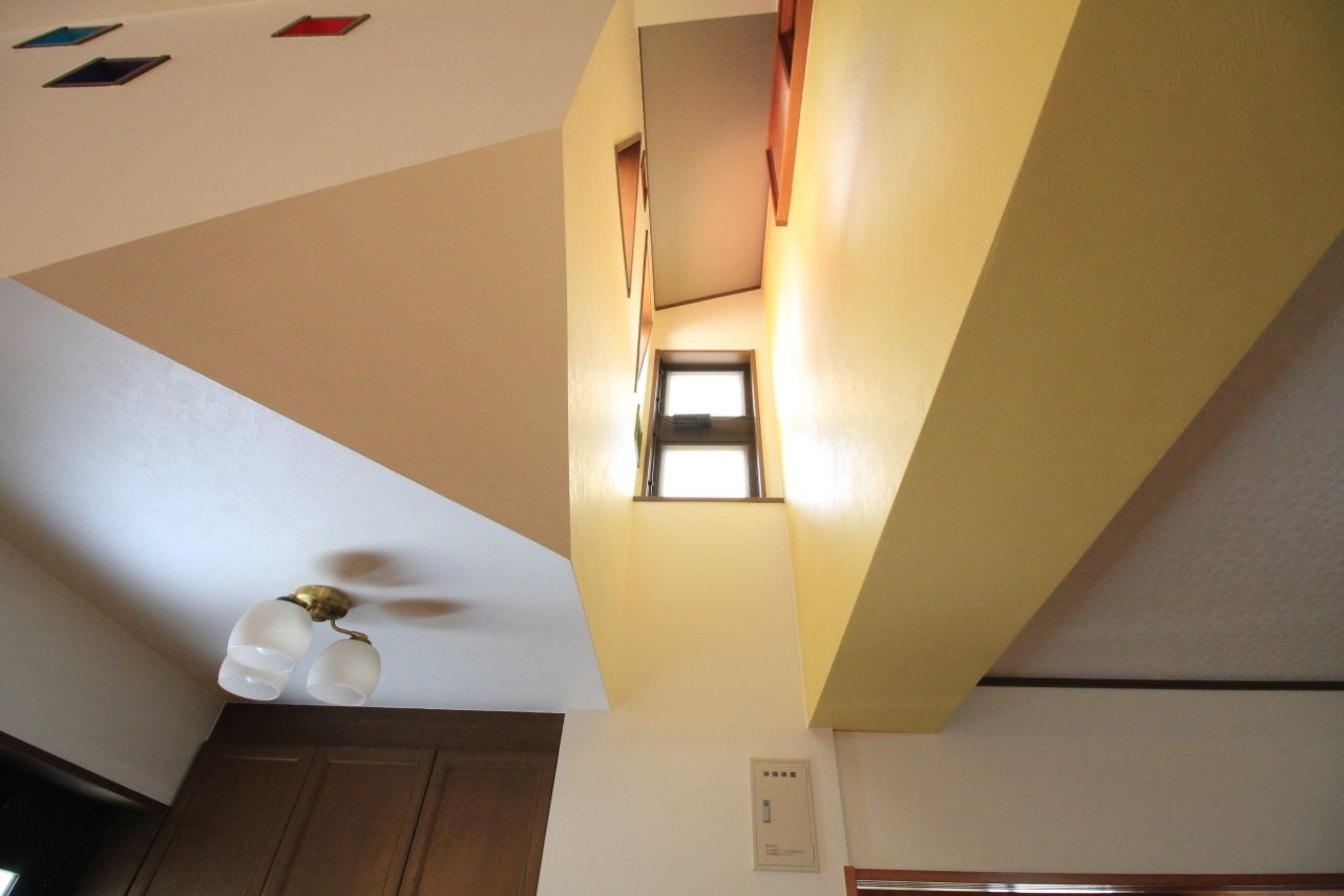 リビングの壁と天井のクロスを貼り替えました。 吹抜けの天井が高いため、足場を組んで作業を行いました。