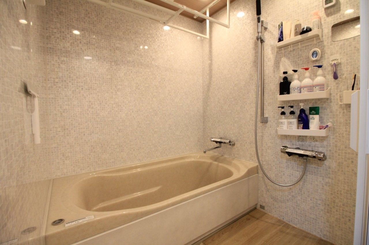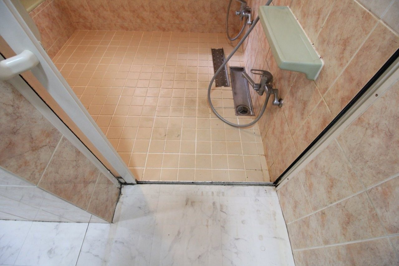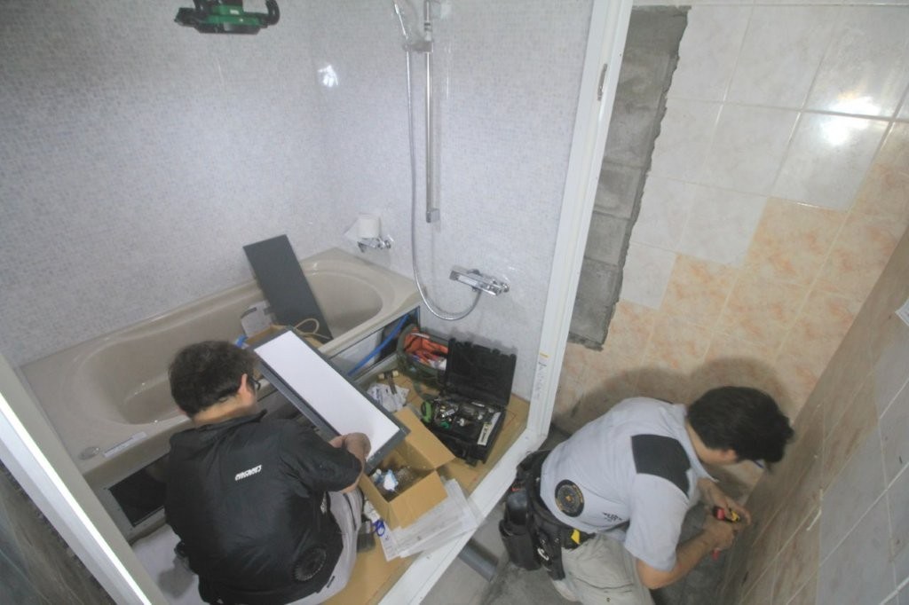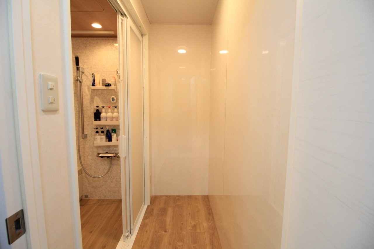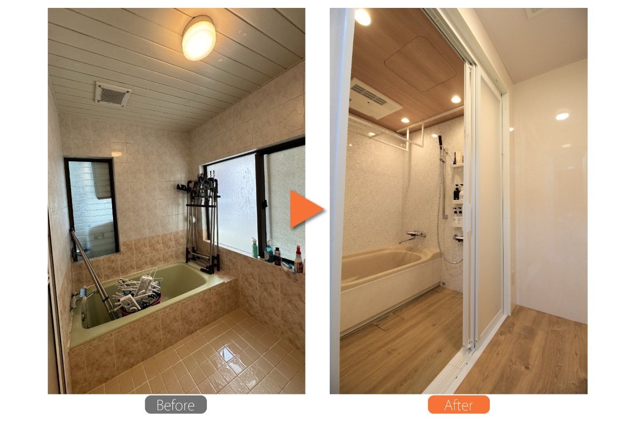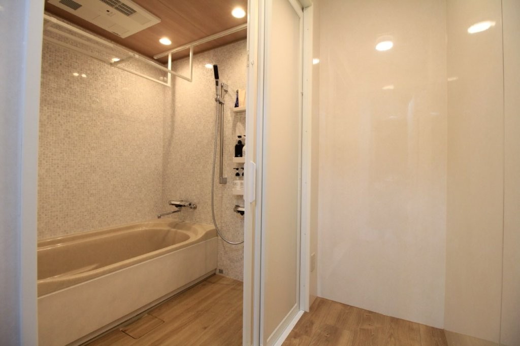 タイル張りの広い浴室を仕切ってシステムバスにリフォームし、新たに脱衣所も設けました。