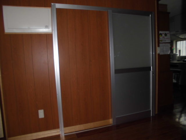施工前のドアは木製の開き戸でした。 これをアルミ製の引戸に取り替えます